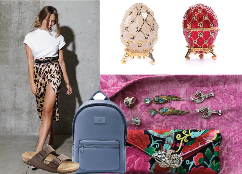 “I have a huge collection of jewelry. Some pieces are family heirlooms, some thrifted and others are fast fashion. Some of my favorite pieces include my blowfish ring and the guitar brooch—it had real strings—that I inherited from my great uncle. Jeffrey, my coworker, says I dress like a Fabergé egg. I can't wait to get older because the fancy granny look is where I’m headed: floral from head to toe and big costume jewelry.” Most of my pieces are vintage, but other than that, I shop almost exclusively at ASOS. I love Never Fully Dressed, a UK-based boutique. The Leopard Jaspre wrap skirt ($75) is a go-to for me. Also, I live in Birkenstocks ($100), and my favorite errand-running bag is the Mini Dagne Dover Backpack ($135).”