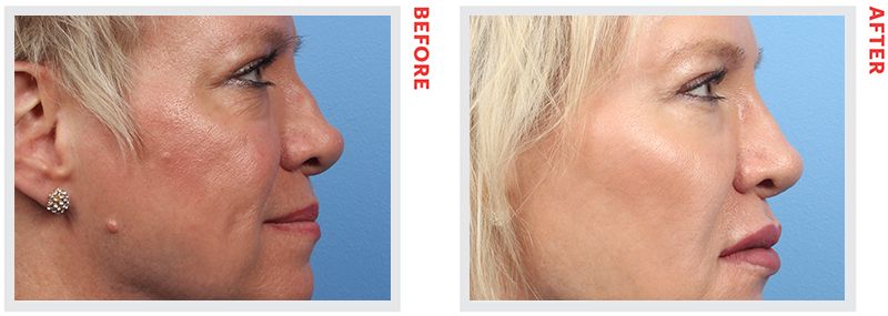 This 58 year-old patient had a collapse in her nose following septum surgery. Scottsdale, AZ facial plastic surgeon James Bouzoukis, MD relied on several sessions of filler to improve the profile of her nose.