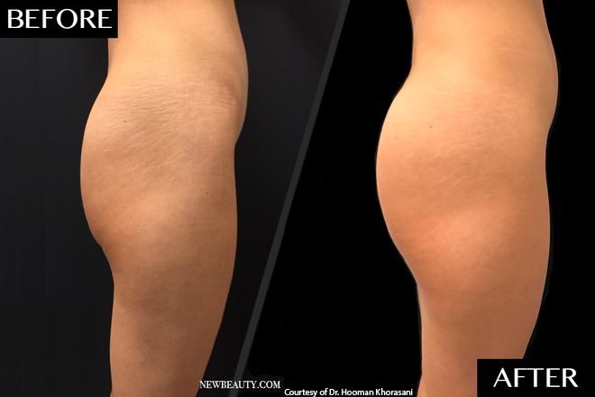 This 35-year-old patient underwent two sets of Sculptra injections to the butt with Dr. Hooman Khorasani. The after photo was taken 12 weeks after the first set of injections.