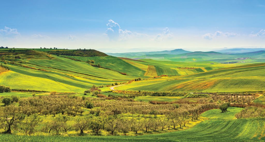 Apulia countryside view, olive trees, rolling hills and green fields landscape. Poggiorsini, Bari, Italy Europe