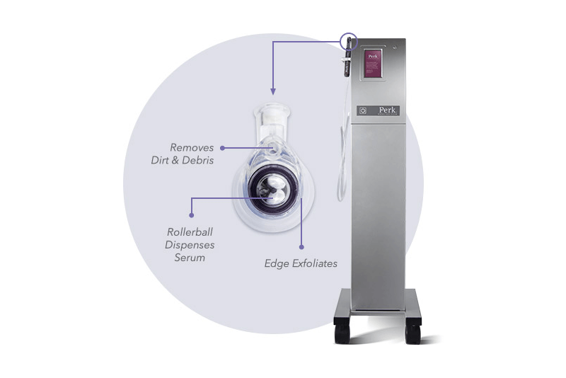 Much like its parent company, HydraFacial, PERK’s two-part system starts with suction exfoliation and ends with a tailored serum infusion. A lactic acid solution is combined with five settings of varying vacuum intensity to dislodge everything from surface oil to deep blackheads. After a thorough exfoliation, skin is drenched in an antioxidant serum packed with vitamins A and E, hyaluronic acid and natural extracts. The results: a clear complexion, immediate brightening and a clean so deep you can see the extractions before they’re poured down the sink. The whole treatment takes 10 minutes with no downtime and can be tailored to the eye area, lips or full face.