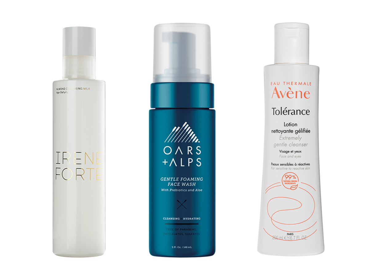 Left to right: Irene Forte Almond Cleansing Milk ($89), Oars + Alps Gentle Foaming Face Wash ($20), Avène Tolerance Extremely Gentle Cleanser ($24)