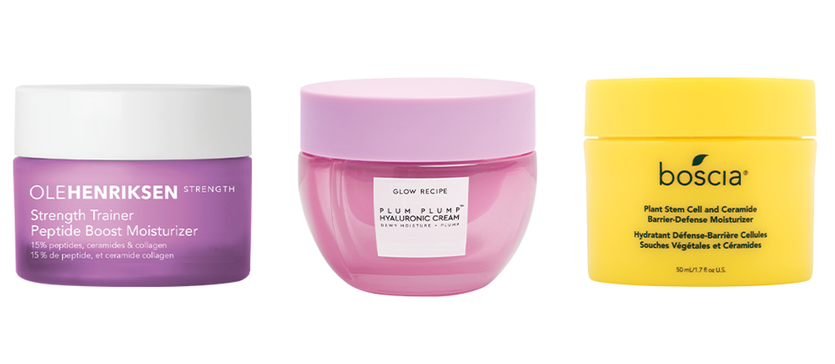 Left to right: OLEHENRIKSEN Strength Trainer Peptide Boost Moisturizer ($48), Glow Recipe Plum Plump Hyaluronic Cream ($39), Boscia Plant Stem Cell and Ceramide Barrier-Defense Moisturizer ($42)