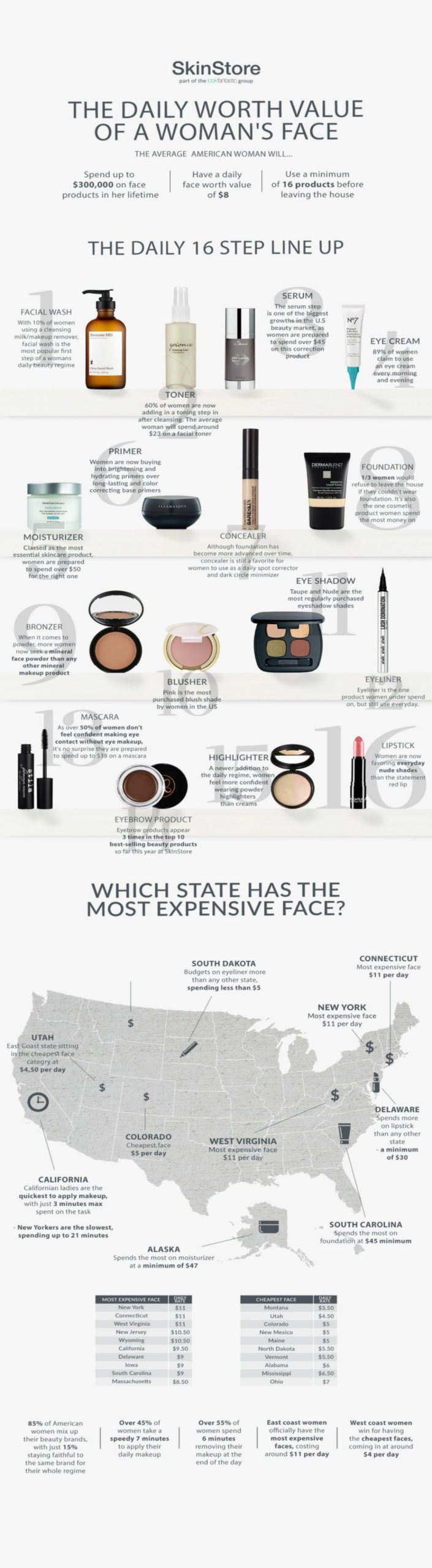 For starters, the results found the average American woman spends $8 on her face per day and applies 16 products minimum prior to walking out the door in the morning. New York, Connecticut and West Virginia ranked first for the “most expensive face” (those three states spend $11 per day), while Colorado was “the cheapest” with $5 per day. The survey polled 3,000 women between the ages of 16 and 75.