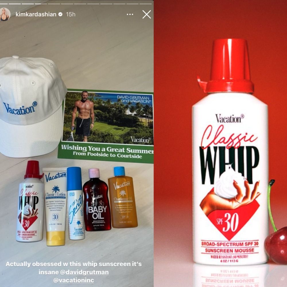 Showing off a haul of some of the brand's most famous products—including the Classic Whip SPF 30 ($22) and the Classic Lotion SPF 30 ($18)–Kardashian placed herself among the ranks of celebs and fans alike who sing the praises of Vacation sun care. "Actually obsessed with this whip sunscreen," Kim wrote in regards to the Classic Whip, "it's insane."