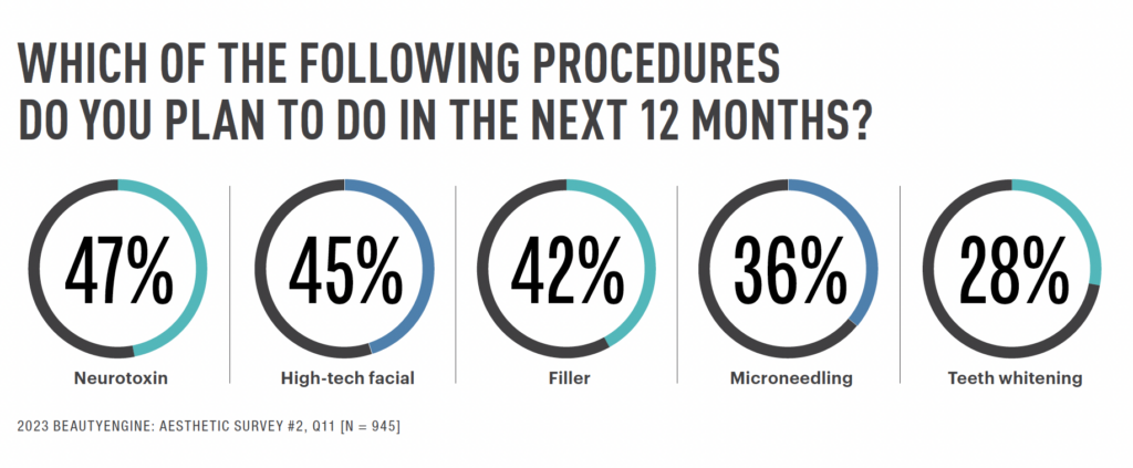 Aesthetic treatments remain highly sought-after, with 47% of respondents planning to get neurotoxin injections in the next 12 months. After wrinkle relaxers, 45% opted for high-tech facials, and 42% chose fillers as their next treatment, proving that nonsurgical “tweakments” continue to be top of mind for American patients wanting to refresh their look.