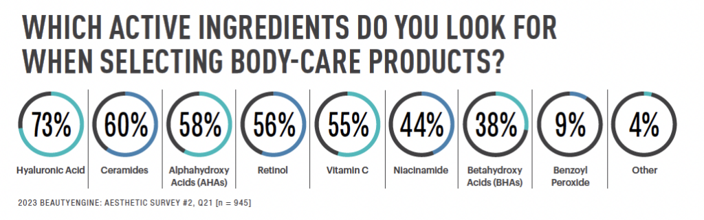 Skin care concerns don’t only reside on our faces and more body products have launched recently that extend our routines below the neck. When asked which ingredients they look for most, Hyaluronic acid took the top spot with 73% of respondents choosing it as a preferred ingredient, followed by ceramides at 60% and alphahydroxy acids (AHAs) at 58%.