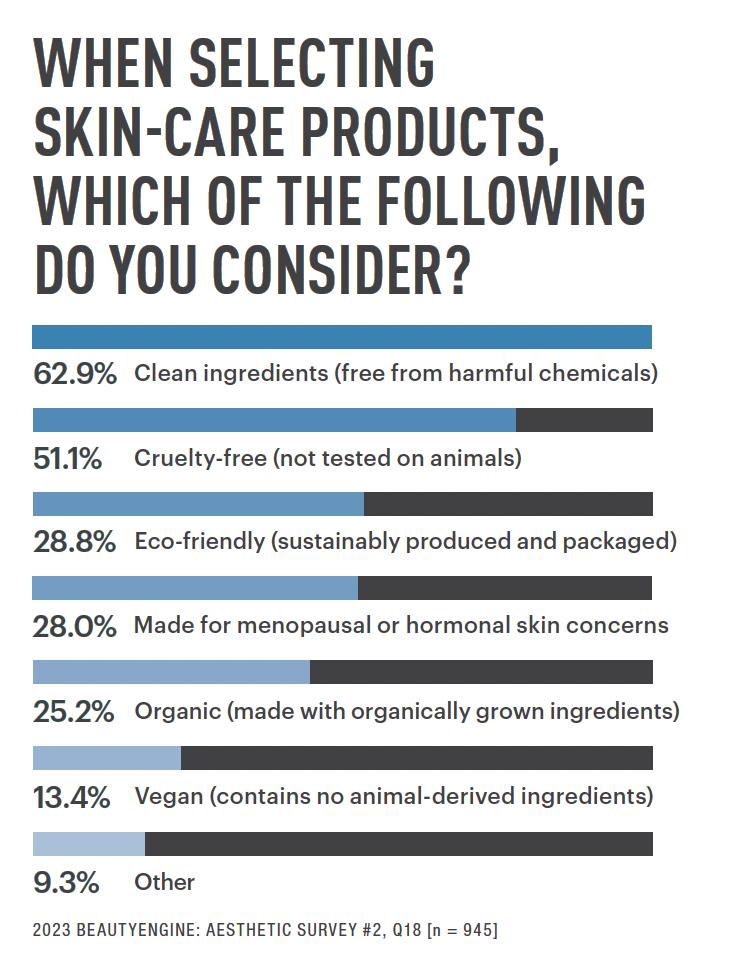 Consumers are becoming increasingly conscious of the products they use on their skin. Clean ingredients and cruelty-free options are significant considerations for 62.9% and 51.1% of respondents, respectively, when selecting skin care products. This growing trend indicates consumers’ increasing awareness about the products they use on their skin.