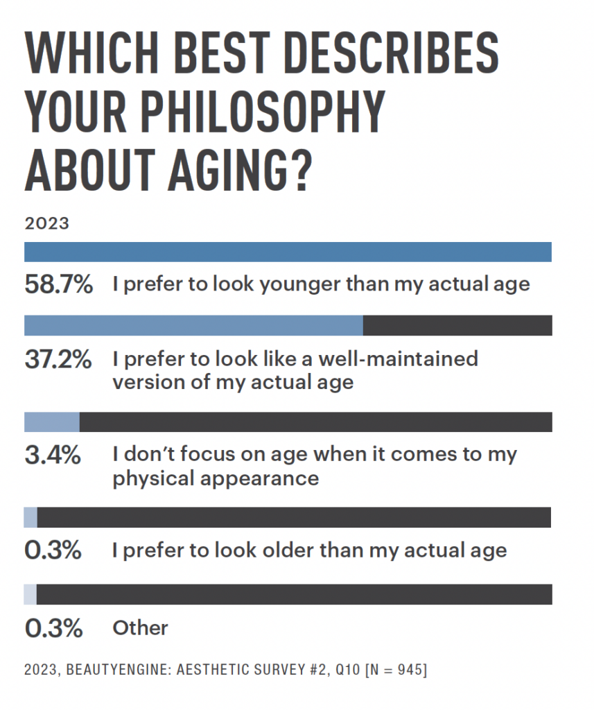 Our attitudes towards aging have constantly been evolving over time, but what we’ve learned is that looking like a refreshed version of ourselves is most important. According to the report, nearly 60% of respondents prefer to look younger than their actual age, emphasizing the importance of treatments that provide natural and rejuvenated results. The report also shows that 58.7% of respondents prefer to look younger than their actual age, while 37.2% aim to appear like a well-maintained version of their actual age.