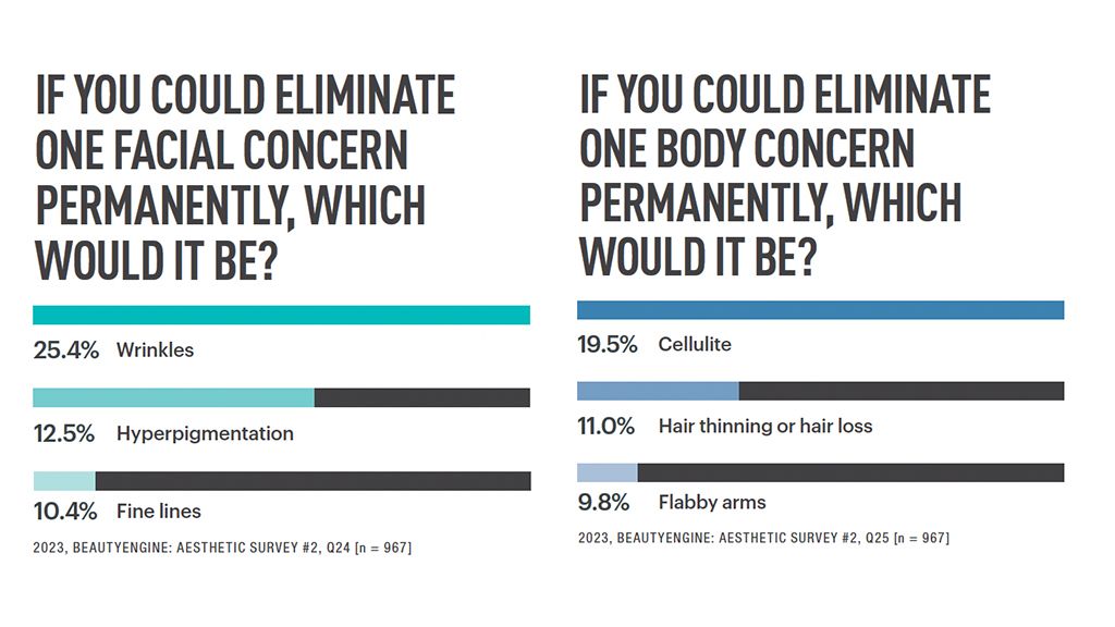While aging philosophies are evolving, there are still common areas of concern that people want to improve with signs of aging and skin laxity being top of mind. The statistical data reveals that patients are most interested in finding permanent solutions for improving their facial concerns, with the top three concerns being wrinkles (25.4%), hyperpigmentation (12.5%), and fine lines (10.4%). When it comes to body concerns, the data shows that patients are looking for long-term solutions to address cellulite (19.5%), hair thinning or hair loss (11.0%), and flabby arms (9.8%).