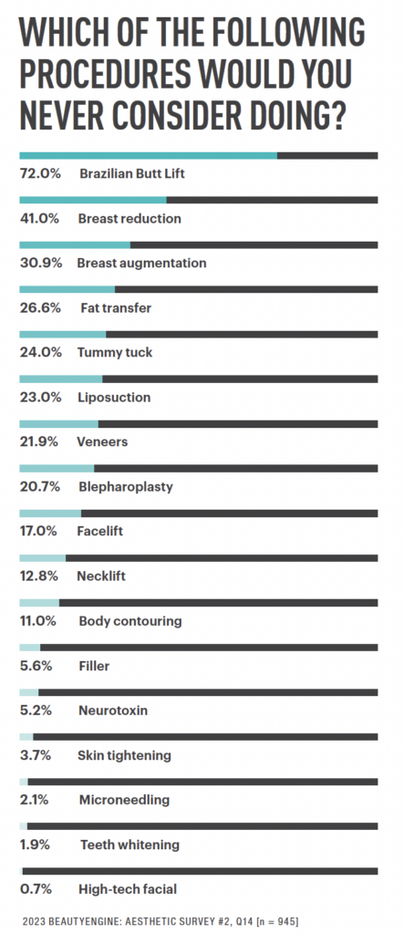 According to the report, the Brazilian Butt Lift remains the most aversive cosmetic treatment for the second year in a row. Breast reductions and breast augmentations follow, but not too close behind. Some patients may be concerned about potential risks and complications associated with BBL, such as fat embolism, infection and anesthesia-related issues.