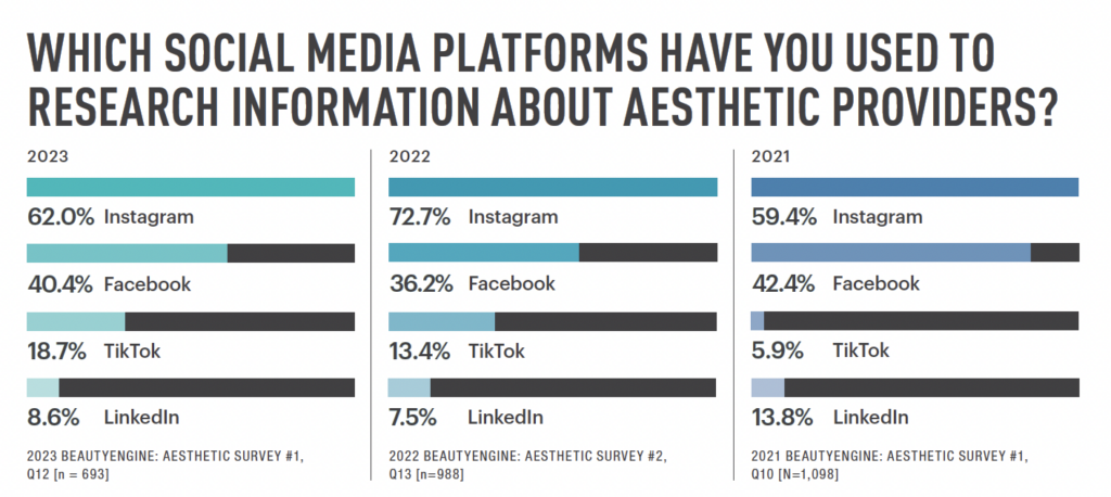 Unlike other aesthetic studies that provide information gathered a year before, this report presents the most up-to-date insights on the platforms consumers use to research aesthetic providers. The data shows a significant shift towards TikTok as a source of patient information, indicating the need for engaging and informative content on this platform. Respondents revealed that 62.0% of consumers used Instagram to research aesthetic providers in 2023, while 40.4% use Facebook, 18.7% use TikTok, and 8.6% use LinkedIn. TikTok’s popularity as a platform for patient information has increased by 12.8% since 2021. Given the changing landscape, these numbers show how imperative it is for social media content about aesthetics to be engaging, informative and brief top capture the attention of viewers.