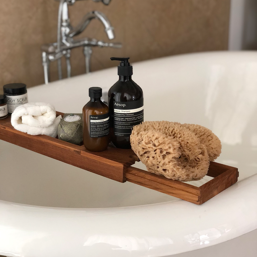 From what we can make out: The shower is home to what appears to be a body brush and cult-favorite Fresh Brown Sugar Body Polish Exfoliator ($39), while the freestanding tub plays host to a mix of Aesop products.