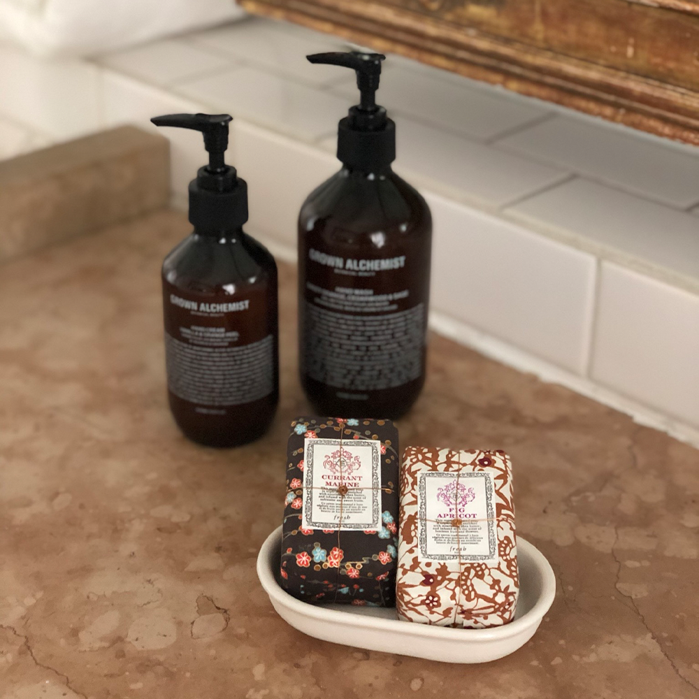 Update: Designer Yael Weiss, who staged the space, confirms she used a mix of products from Byredo, Grown Alchemist, Aesop, Apotheke and Fresh—which she loves in particular because "their soaps are packaged so prettily!"