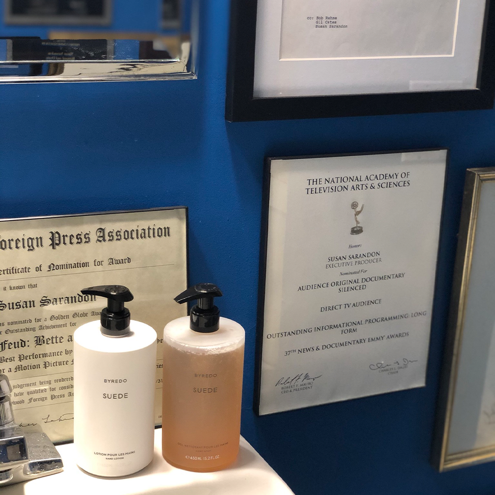 Besides what the realtors refer to as the "Academy Award bath"— a cobalt-blue painted room where Sarandon keeps all of the awards (including her Oscar for Dead Man Walking) she's earned over the course of her career, there's also some enviable beauty products that make the pictures.