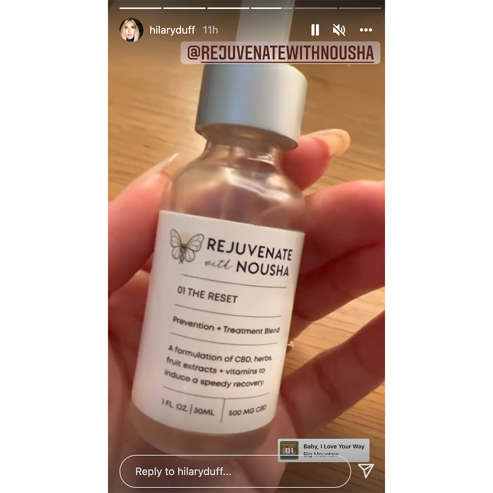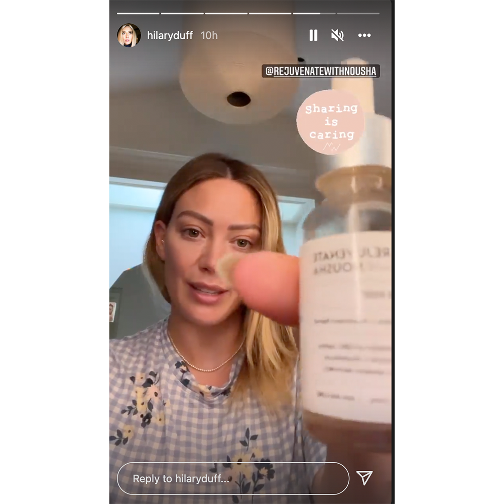 In the first slide of her story, she shares a video of herself holding up the Rejuvenate With Nousha The Reset ($111) with Baby, I Love Your Way playing in the background. "Guys, I like to post things that I use and things that I love and this Rejuvenate With Nousha is my friend," she says. Talking about Nousha Salimi herself—she's a NYC-based aesthetician—Duff adds, "She made this beautiful oil that I'm obsessed with and I feel like everyone should try it."
