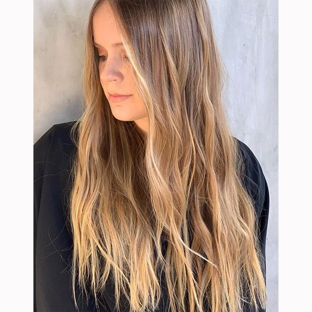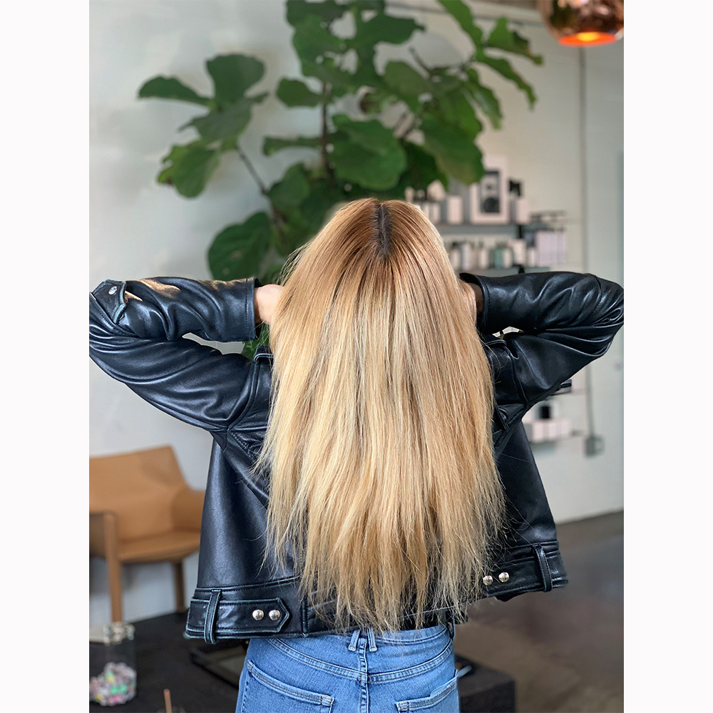 “In my lightener, I always use a bond-builder like Olaplex or B3 Brazilian Bond Builder,” adds Roberts. “I also make sure to use a very low developer and avoid applying heat while processing. I’ll also include some lowlights, or reverse balayage, to create depth.”