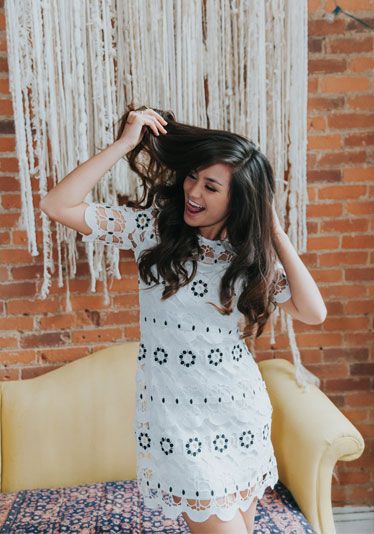 Caila Quinn: After I shower each morning, I brush out the ends of my wet hair and start by blow-drying my bangs on high heat, just running my fingers through my hair loosely. I finish drying my hair by holding all of my ends together—it gives the ends a natural curl. Next I use finishing spray to prevent frizz and then I run my fingers through my dry hair before I curl it. I use a 1-inch Conair barrel curling iron, starting in the middle, then slowly working the curler to the end, where I hold it for a little more time. Gotta get that bounce, you know?