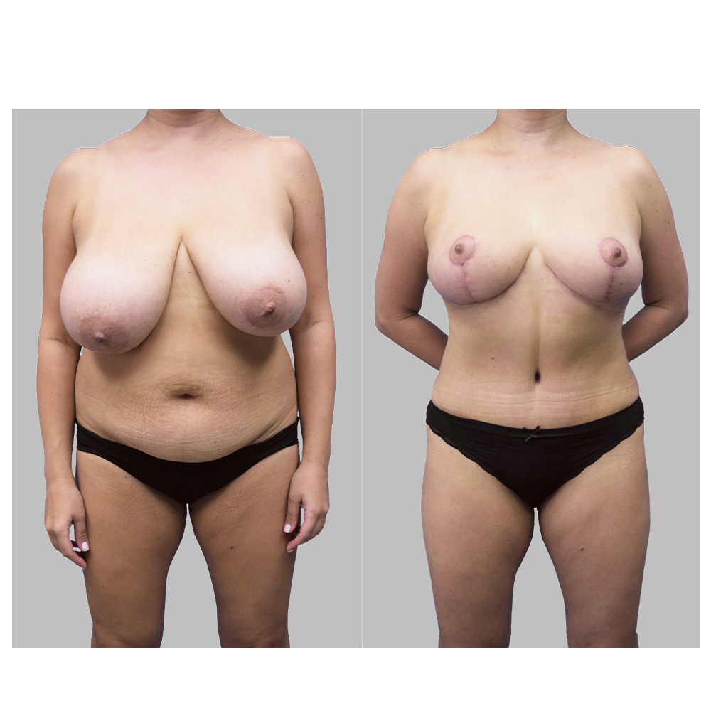 Dr. Bachilo performed a mommy makeover which included a breast reduction, tummy tuck and liposuction to the abdomen, waist and bra strap area to even out this 50-year-old patient’s breasts and tighten her midsection.