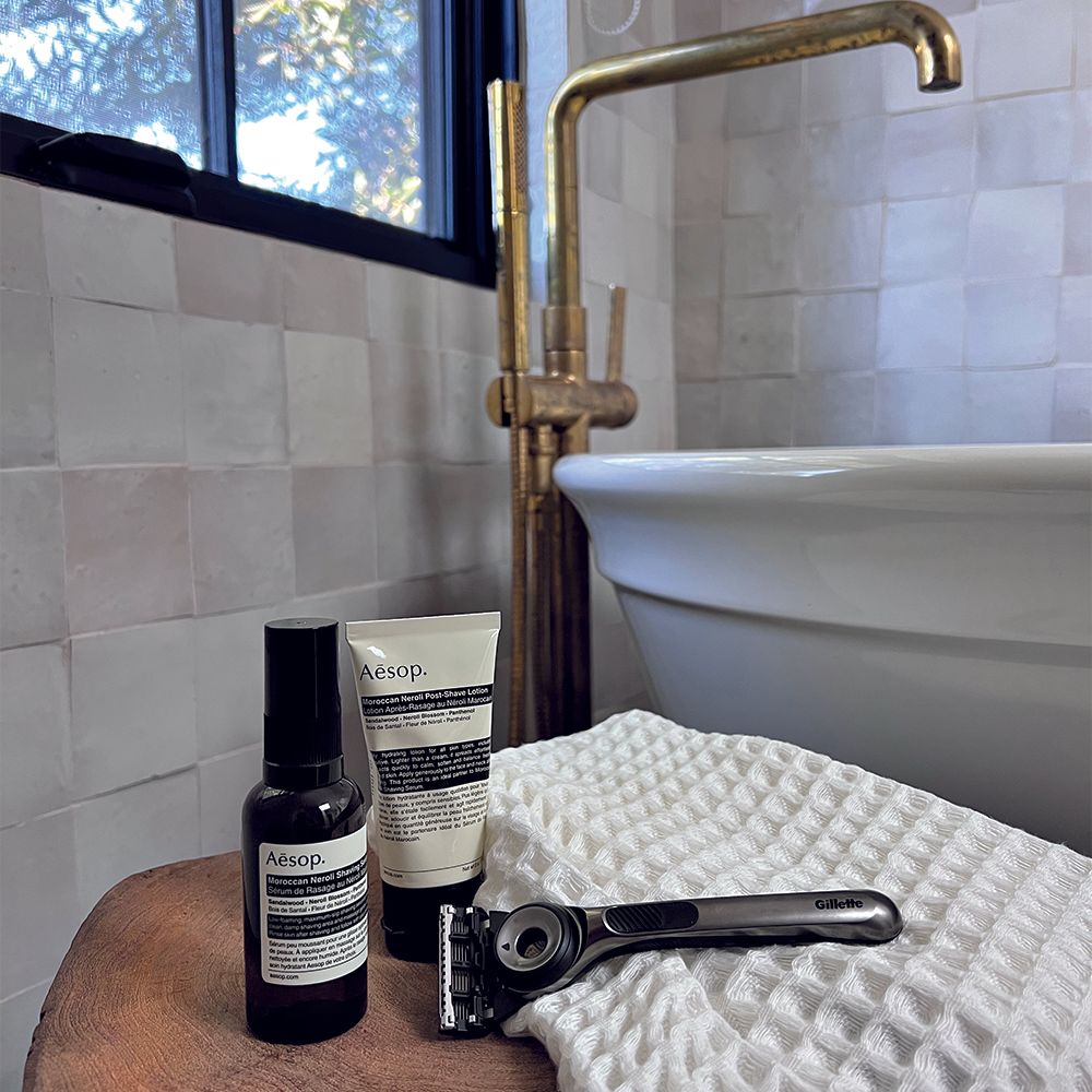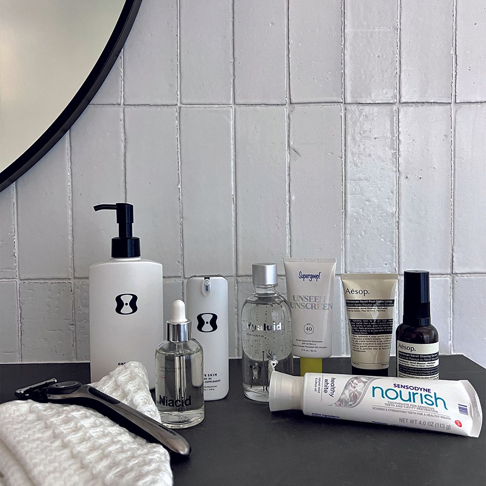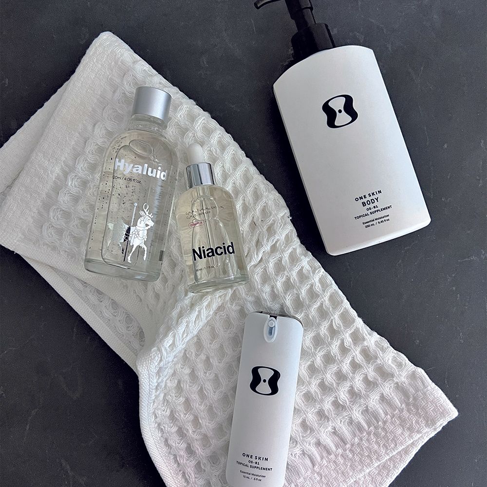 Aesop Moroccan Neroli Shaving Duet ($85); Slurp Laboratories Hyaluid ($62); Slurp Laboratories Niacid ($45); OneSkin OS-01 Face Topical Supplement ($120); OneSkin OS-01 Body Topical Supplement ($99)