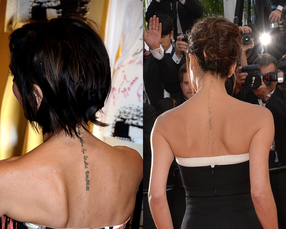Beckham’s upper back tattoo, which reads in Hebrew, “I am my beloved’s and my beloved is mine,” is a tribute to her husband David Beckham (he has the same phrase written on his arm) and runs along the upper portion of her spine. However, the prominent tattoo seems to be slowly disappearing (assumably thanks to laser tattoo removal), with every public appearance revealing a more faded version of it than before.