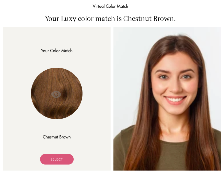 Accessible via mobile or desktop, the tool cuts out the back-and-forth color-matching service some other hair extension companies offer, where you send in a picture of yourself and a representative gets back to you soon enough with their recommendation. “With our tool, the customer has the option to take an instantaneous photo or upload one from her/his/their existing arsenal," says Sveda. "A match is delivered instantly, taking the guesswork out of the customer journey. As a digitally native beauty brand, technology has always been a priority for Luxy as a way to create more experiential interactions with our customers. The pandemic wasn’t the initial catalyst for us, but it certainly crystalized the necessity for AI advancements given the increased traffic to the DIY hair e-commerce space."