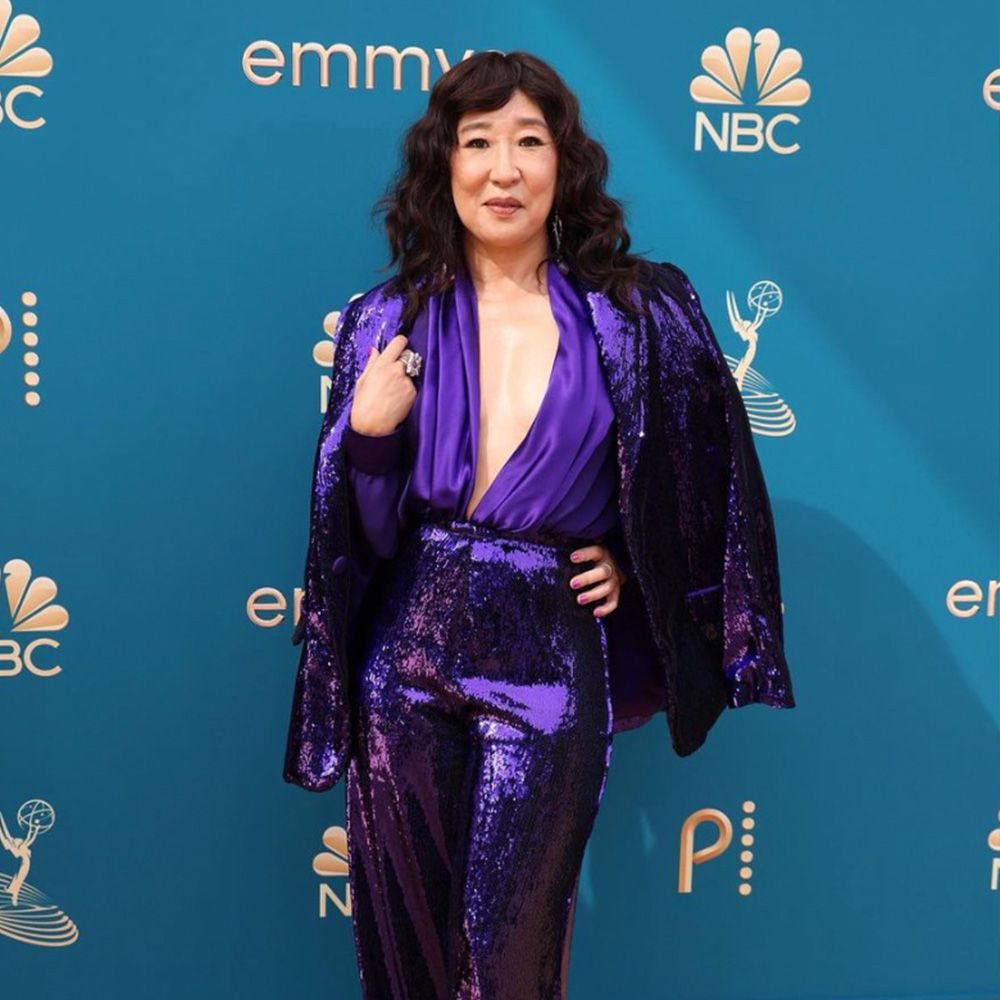 Sandra Oh, nominated for Best Lead Actress in a Drama Series, was a show stopper at the Emmys. She wore a purple Rodarte outfit, the jacket and pants of which were speckled with sequins. The look evokes Studio 54, complete with voluminous hair and low-hanging earrings.