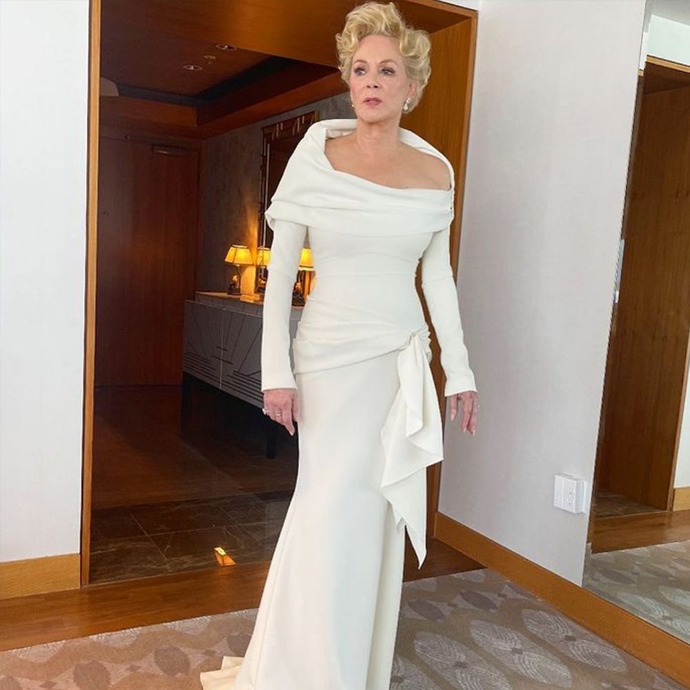 Jean Smart won her second Emmy in a row for Hacks, and she showed up looking like a winner. She served up timeless glamorous with a white off-the-shoulder Christian Siriano dress, perfectly coiffed hair and just the right balance of makeup and natural beauty.
