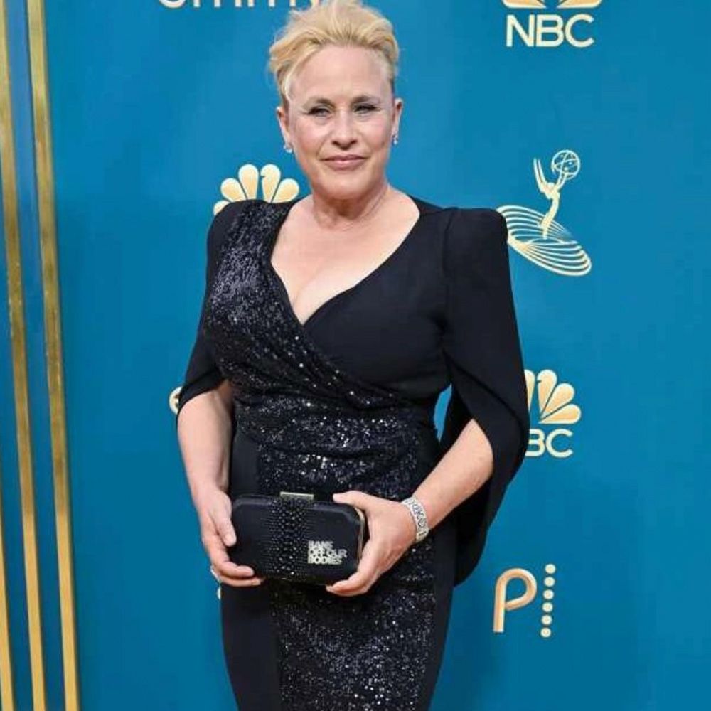 A textured updo, a nude lip and eye makeup that flatters her baby blues are the standout pieces of Patricia Arquette’s look. She’s up for Best Supporting Actress in a Drama Series for her work in Severance. Alongside Smith-Cameron, Arquette was also toting a “Bans off Our Bodies” clutch.