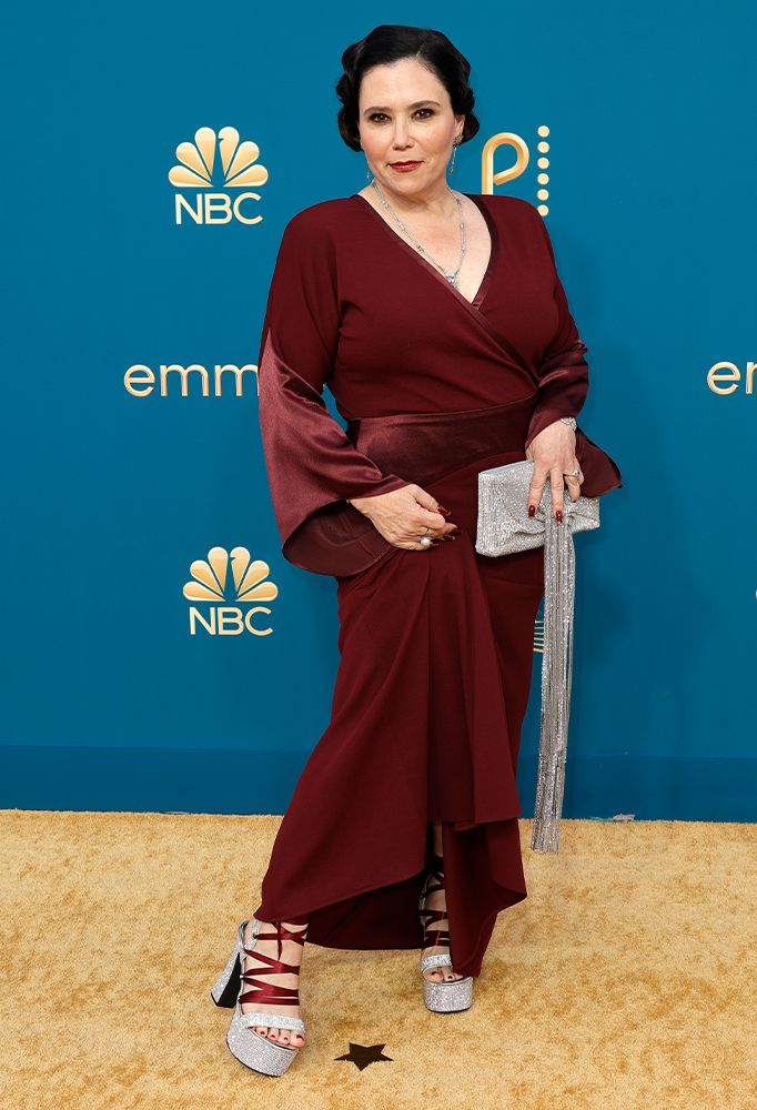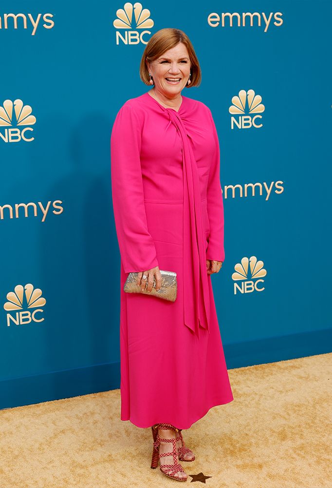 Nominated for her role in Dopesick, Mare Winningham wore a bright pink dress with funky heels. The ‘80s and ‘90s icon wore makeup that was done to perfection, and her sleek bob was chic.