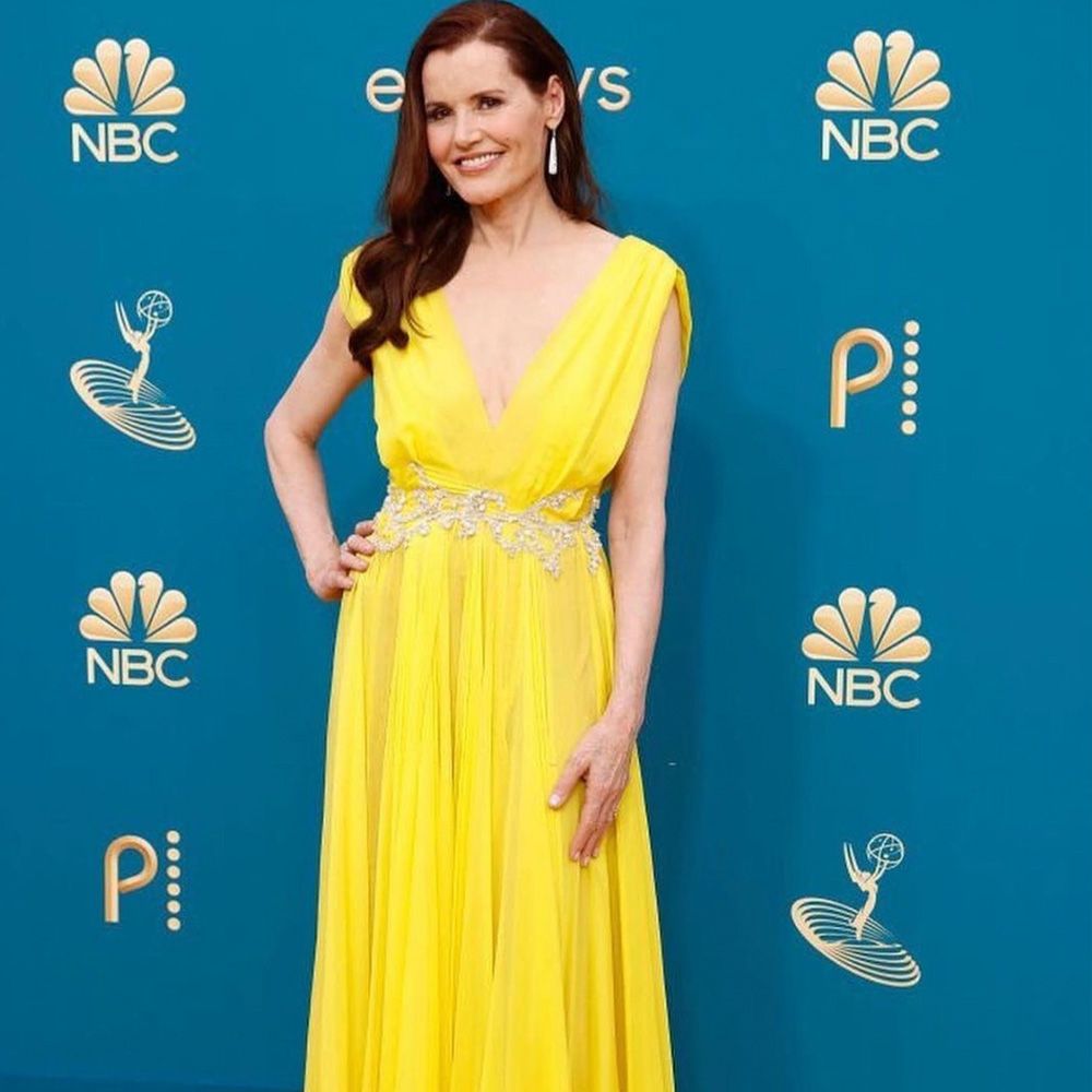 The iconic actress accepted the Governor's Award at the 2022 Emmys for her non-profit Geena Davis Institute on Gender in Media. Her hair and makeup were timeless and worked well with her sleeveless yellow dress.