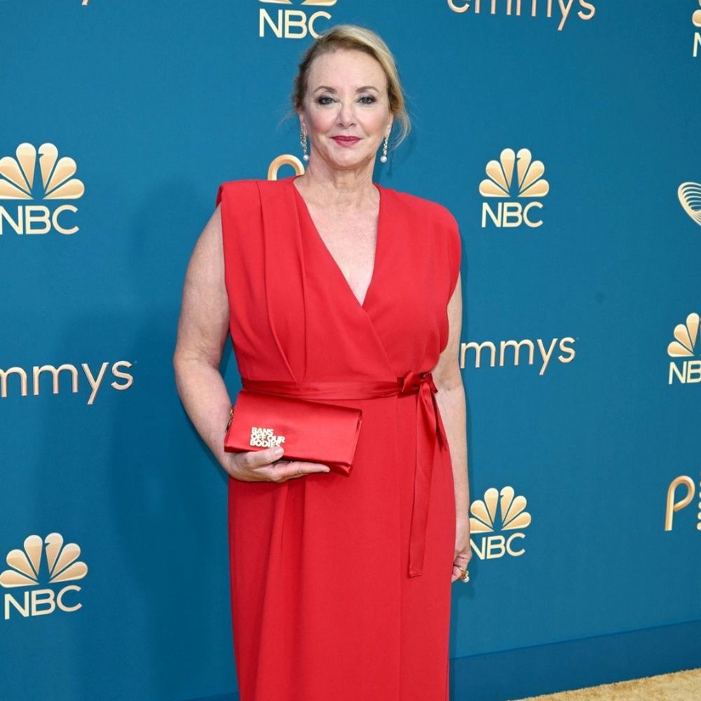 With 25 Emmy Award nominations, Succession is leading the pack tonight. One of those nominations is for J Smith Cameron in the Outstanding Supporting Actress In A Drama Series category. A lady in red, she wore heavy eyeliner and a bright lip. Her accessory of choice? A clutch that says “Bans Off Our Bodies.”