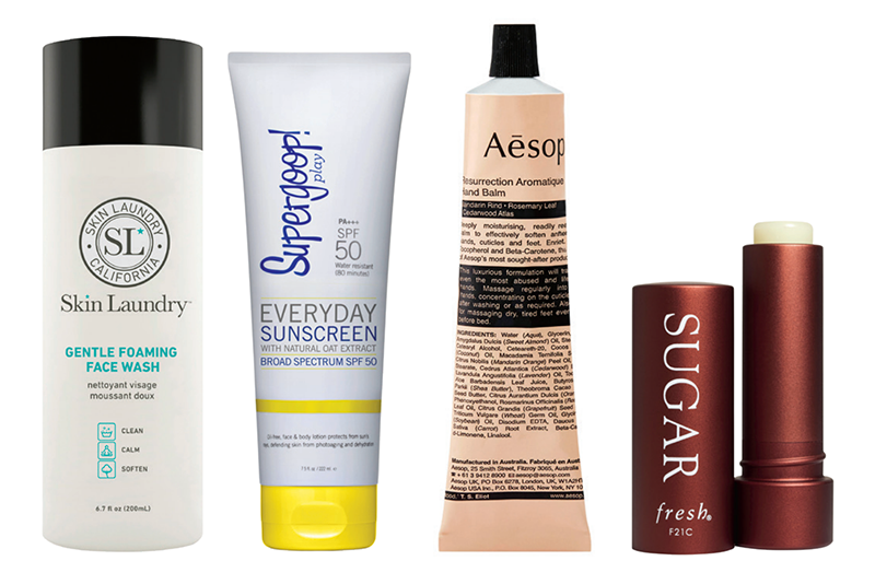 “I start every day with Skin Laundry Gentle Foaming Face Wash ($20, which we designed for sensitive skin because it isn’t drying. I believe SPF is a must-have—just like wearing a seat belt!—so I use Supergoop! Everyday Sunscreen SPF 50 ($32), well, every day! And because I’m always traveling to visit our global locations, I can’t live without Aesop Resurrection Aromatique Hand Balm ($27) and Fresh Sugar Lip Treatment SPF 15 ($24)—both are perfect while I’m on the go!”