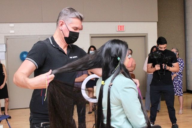 Gregory White, stylist and field education leader for Hair Cuttery Family of Brands, was tasked with performing the record-breaking chop, and consulted with Khan ahead of their meeting. "After having a video call with Zahab, I could tell that she wanted to maintain as much length as possible after her donation. After measurement, it appeared shoulder-length was the way to go. I chose to do an A-line lob, which is a longer version of a bob haircut. This would allow her to still be able to wear it in a low ponytail because she is so athletic. It also added framing to her beautiful face and created a very sophisticated style."
