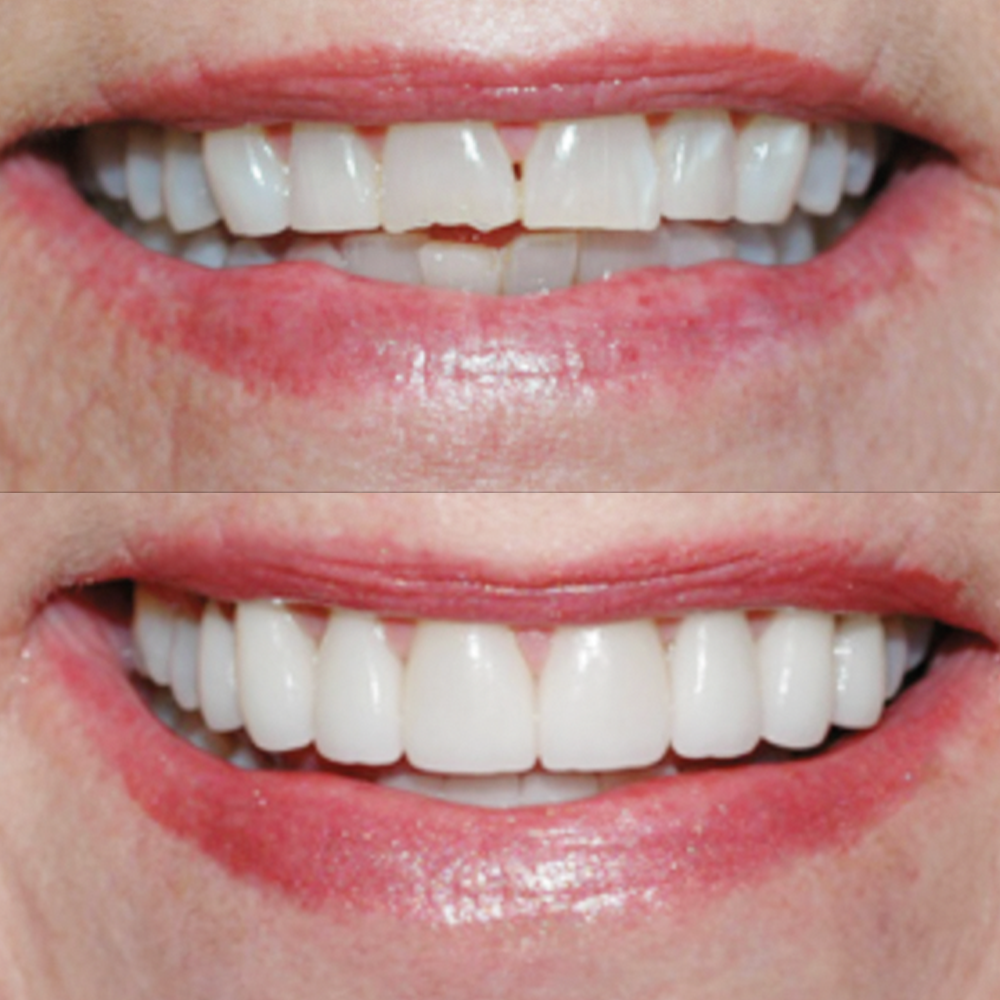 To help brighten this 30-year-old patient’s smile and close unwanted gaps, Dr. Hoffman performed in-office teeth whitening and placed eight veneers on her upper teeth.